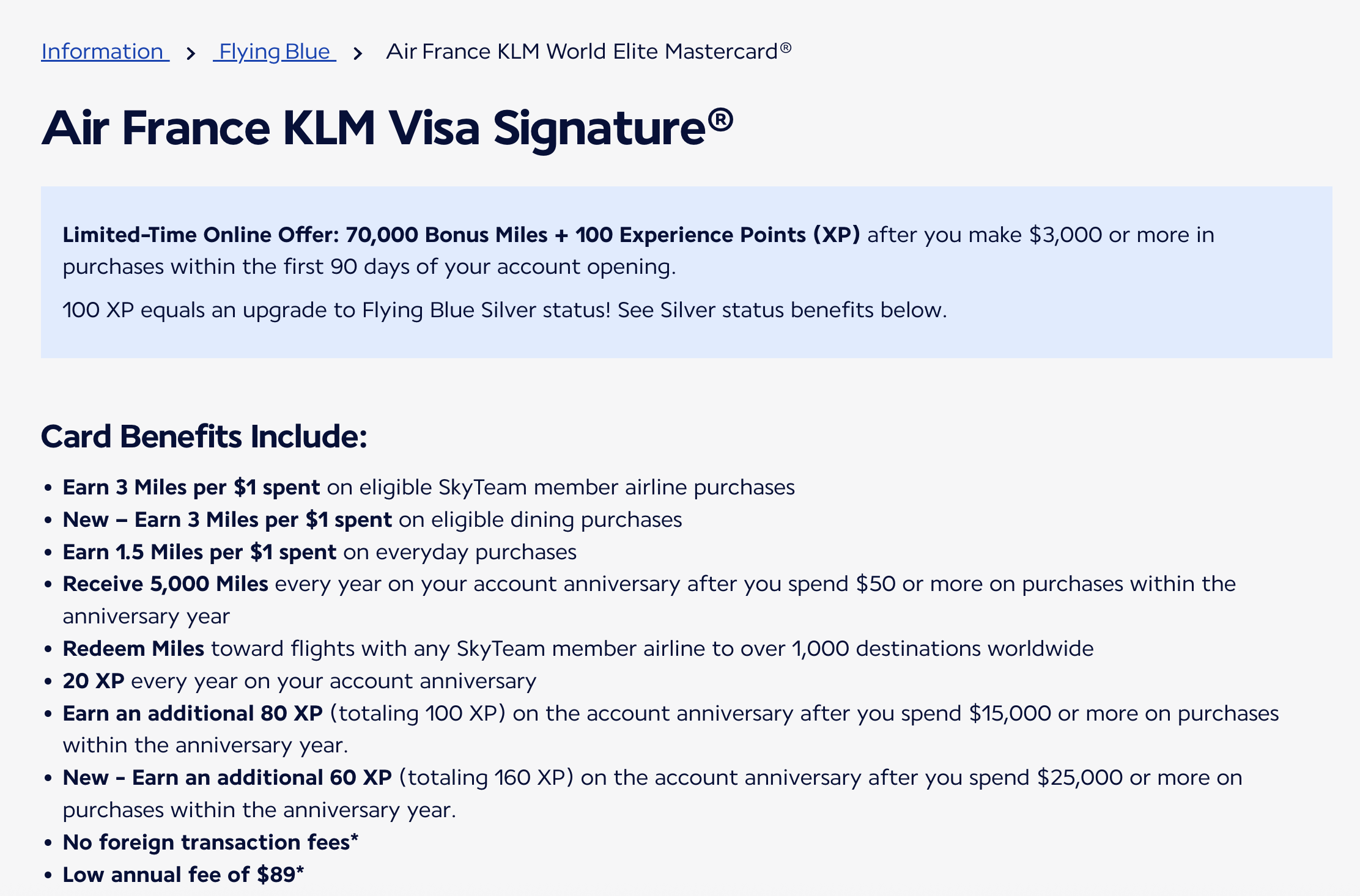 バンク・オブ・アメリカのエアフランス/KLMフライングブルーカードでは、サインアップ時に70,000ポイントのボーナスを提供しています。さらに、100 XPも獲得できます。