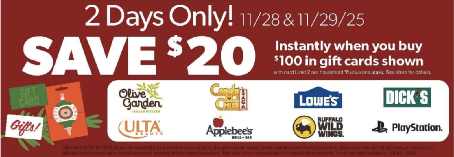 11月28日から29日まで、Lowe’sやUltaなどのギフトカードが20%オフで購入できます。ただし、購入は最大2枚までとなっています。