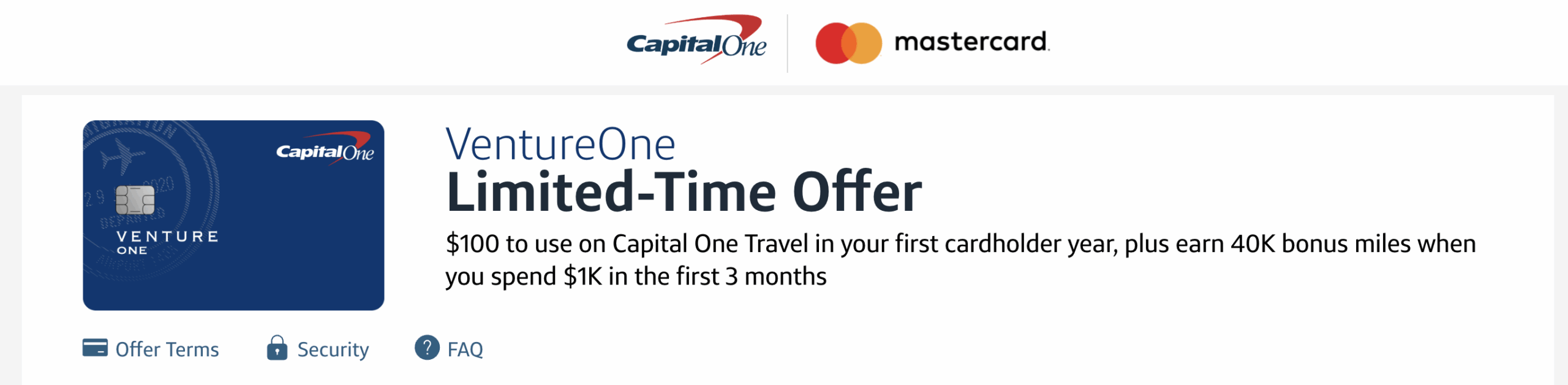 Capital One VentureOneカードでは、初回の購入で$100のキャッシュバックと40,000ポイントを獲得できます。